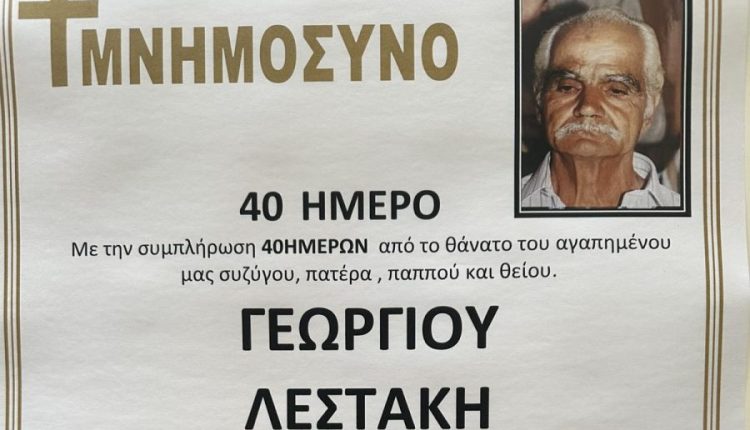 Την Κυριακή 16 Νοεμβρίου στις 8.30 π.μ. στον Ι.Ν. Αγίας Τριάδος θα τελεστεί το 40ήμερο μνημόσυνο του Γεωργίου Λεστάκη στις Κορφές.