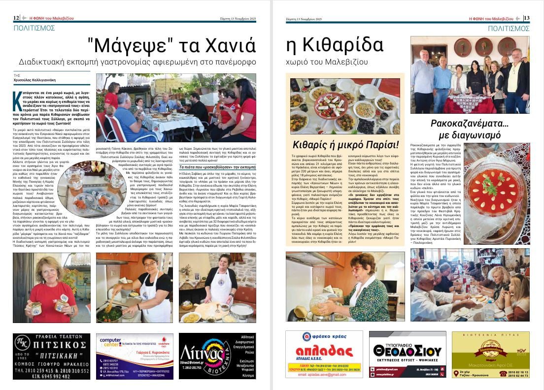 Η διαδικτυακή εκπομπή γαστρονομίας και πολιτισμού «Γεύσεις Κρήτης» των Χανιώτικων Νέων με τον παρουσιαστή Γιάννη Κάκανο, βρέθηκαν στα τέλη του Σεπτέμβρη στην Κιθαρίδα στο σπίτι της γραμματέως του Πολιτιστικού Συλλόγου Σούλας Φιλιππίδη. Εκεί κυριάρχησαν οι μυρωδιές από τις λαχταριστές παραδοσιακές συνταγές με αγνά προϊόντα από τα περβόλια της Κιθαρίδας. Με περίσσια φιλοξενία οι γυναίκες της Κιθαρίδας έκαναν πάλι το θαύμα τους , δημιουργώντας μια γαστρονομική πανδαισία! Μαγείρεψαν για τους Χανιώτες επισκέπτες τους, στολίζοντας το Κιθαριανό τραπέζι με λακταριστές λιχουδιές όπως μόνο εκείνες ξέρουν!