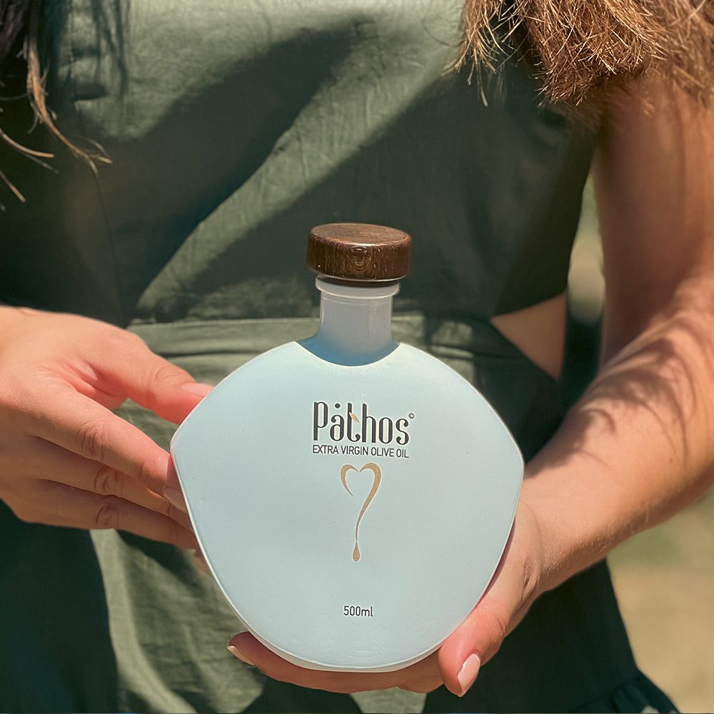 Το ελαιόλαδο Pathos, βραβευμένο και βιολογικό, διατίθεται σε ένα προσεγμένο γυάλινο μπουκάλι των 500ml, μέσα σε πολυτελή χάρτινη συσκευασία που αποπνέει κομψότητα και αυθεντικότητα. Η σχεδίαση του μπουκαλιού αποτυπώνει τη βαθιά σύνδεση με το ιερό δέντρο της ελληνικής γης.
