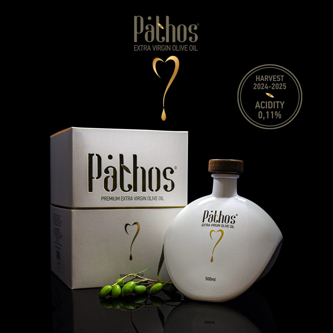 Aπό παραδοσιακό ελαιώνα στις ανατολικές υπώρειες του Ψηλορείτη (περιοχή Καβαλαριάς των Κορφών Μαλεβιζίου, με 52 διεθνή βραβεία σε 3 χρόνια και αναγνώριση για τις υψηλές πολυφαινόλες, πολύ χαμηλή οξύτητα 0,1 και τον ευρωπαϊκό ισχυρισμό υγείας (EU healthclaim 432/2012), το Pathos δεν είναι απλώς ένα ελαιόλαδο. Είναι η έκφραση του πάθους, της αγάπης και της αφοσίωσης στην ελιά και τη γη της Κρήτης.