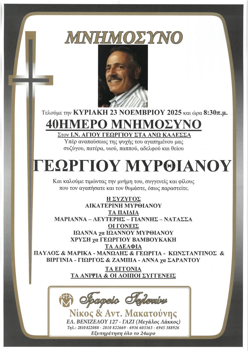 Την Κυριακή 23 Νοεμβρίου 2025 και ώρα 8.30 π.μ θα τελεστεί το σαρανταήμερο μνημόσυνο του Γεωργίου Μυρθιανού στον Ι.Ν. Αγίου Γεωργίου στα Άνω Καλέσσα.