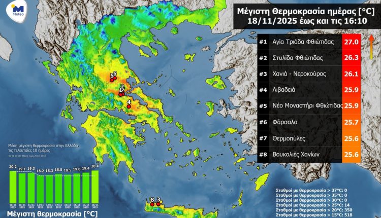 Συνολικά 14 μετεωρολογικοί σταθμοί του δικτύου ΕΑΑ/Meteo κατέγραψαν θερμοκρασίες άνω των 25°C, επιβεβαιώνοντας ότι η ζεστή αέρια μάζα που επηρεάζει την ανατολική και τη νότια Ελλάδα διατηρεί «ανοιξιάτικες» συνθήκες στη μέση του Νοεμβρίου.
