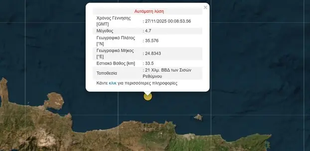 Πιο συγκεκριμένα, ο σεισμός σημειώθηκε 21 χιλιόμετρα ΒΒΔ των Σισών Ρεθύμνου κι έγινε αισθητός σε ολόκληρη την Κρήτη.