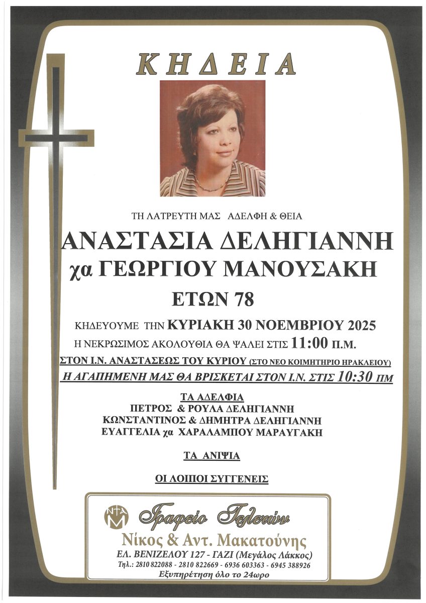 Σε ηλικία 78 ετών έφυγε από τη ζωή η Αναστασία Δεληγιάννη, χήρα Γεωργίου Μανουσάκη. Η κηδεία της θα τελεστεί την Κυριακή 30 Νοεμβρίου 2025, ενώ η νεκρώσιμη ακολουθία θα ψαλεί στις 11:00 π.μ. στον Ιερό Ναό Αναστάσεως του Κυρίου, στο Νέο Κοιμητήριο Ηρακλείου. Η σορός θα βρίσκεται στον ναό από τις 10:30 π.μ.
