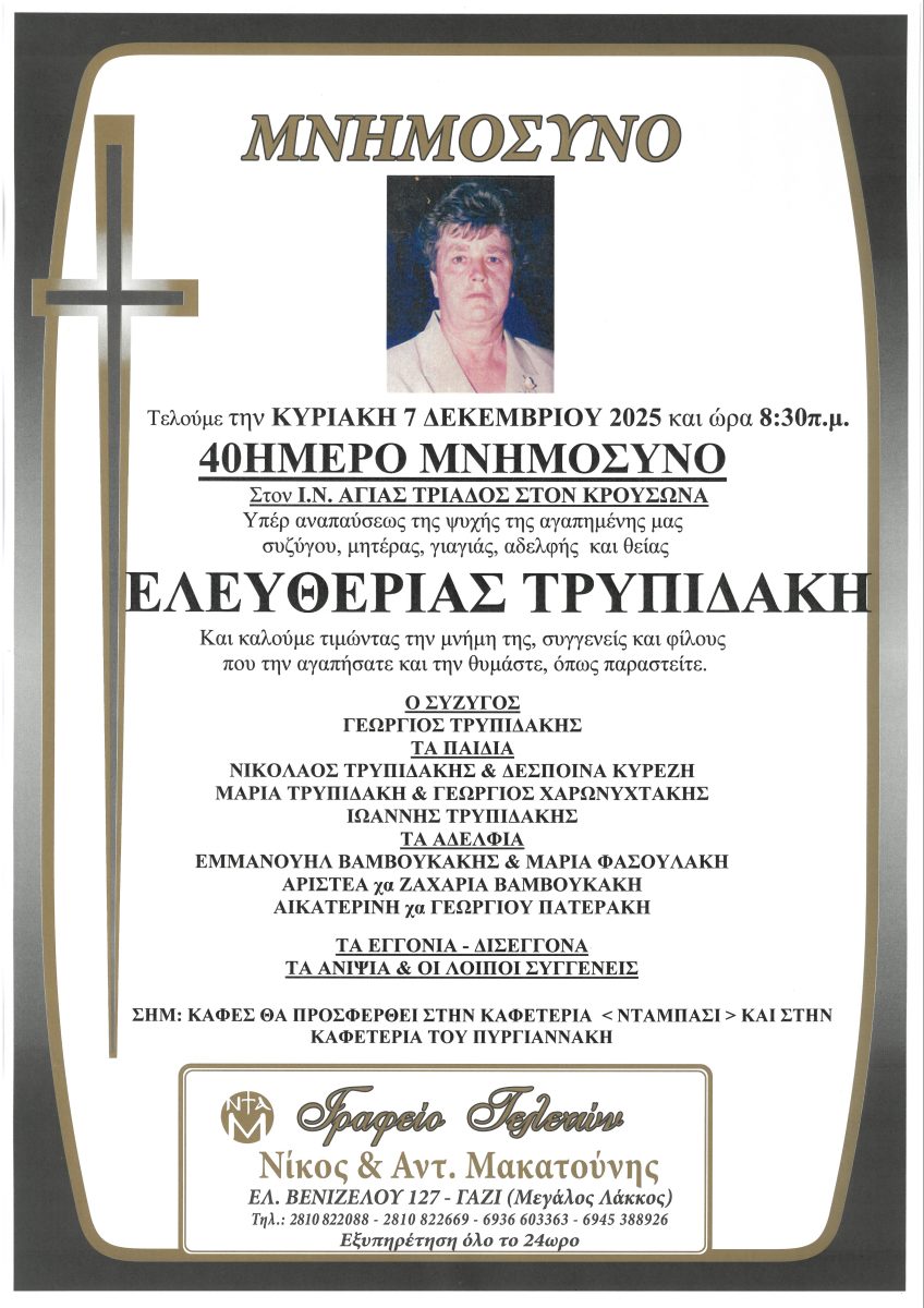Την Κυριακή Κυριακή 7 Δεκεμβρίου 2025 και ώρα 8:30 π.μ. θα τελεστεί το σαρανταήμερο  μνημόσυνο της Ελευθερίας Τρυπιδάκη στον Ι.Ν. Αγίας Τριάδος στον Κρουσώνα.