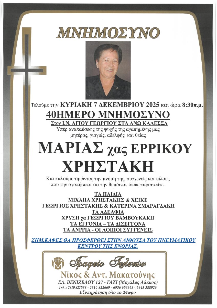 Το σαρανταήμερο μνημόσυνο της Μαρίας χας Ερρίκου Χρηστάκη την Κυριακή 7 Δεκεμβρίου 2025 και ώρα 8:30 π.μ. θα τελεστεί στον Ι.Ν. Αγίου Γεωργίου στα πάνω Καλέσα.