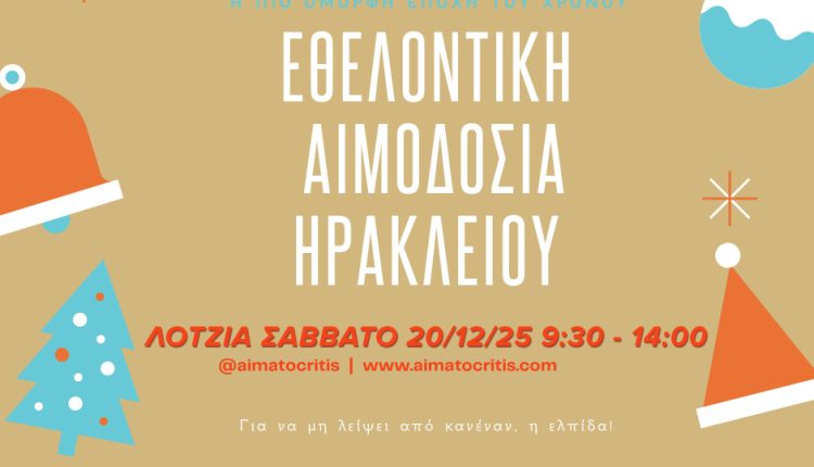 Εθελοντική αιμοδοσία θα πραγματοποιηθεί το Σάββατο 20 Δεκεμβρίου 2025 στο αίθριο της Λότζια, στο κέντρο του Ηρακλείου, από τις 09:30 έως τις 14:00. Η δράση εντάσσεται στις τακτικές αιμοδοσίες που πραγματοποιούνται κάθε Σάββατο και διοργανώνεται από τον Παγκρήτιο Σύνδεσμο Εθελοντών Αιμοδοτών και Δωρητών Οργάνων Σώματος «Αιματοκρήτης», με τη στήριξη του Δήμου Ηρακλείου.