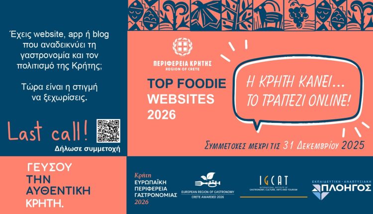 Η Κρήτη, Ευρωπαϊκή Περιφέρεια Γαστρονομίας 2026, ανοίγει την ψηφιακή της κουζίνα στον κόσμο και καλεί δημιουργούς, επαγγελματίες και φορείς να πάρουν θέση στο διεθνές… τραπέζι του διαγωνισμού TOP FOODIE WEBSITES 2026.