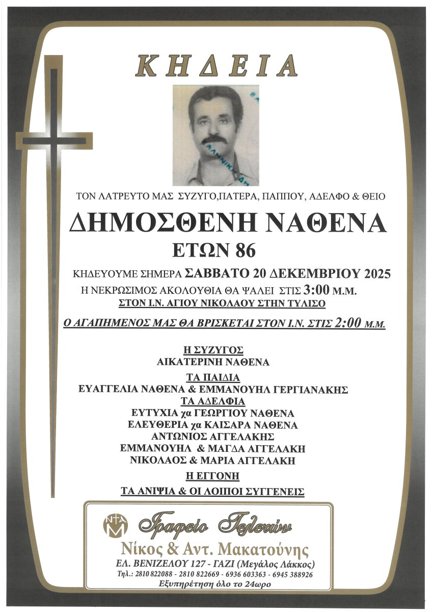 Σήμερα Σάββατο 20 Δεκεμβρίου 2025 και ώρα 3:00 μ.μ. θα τελεστεί η κηδεία του στον Ι.Ν. Αγίου Νικολάου στην Τύλισο.