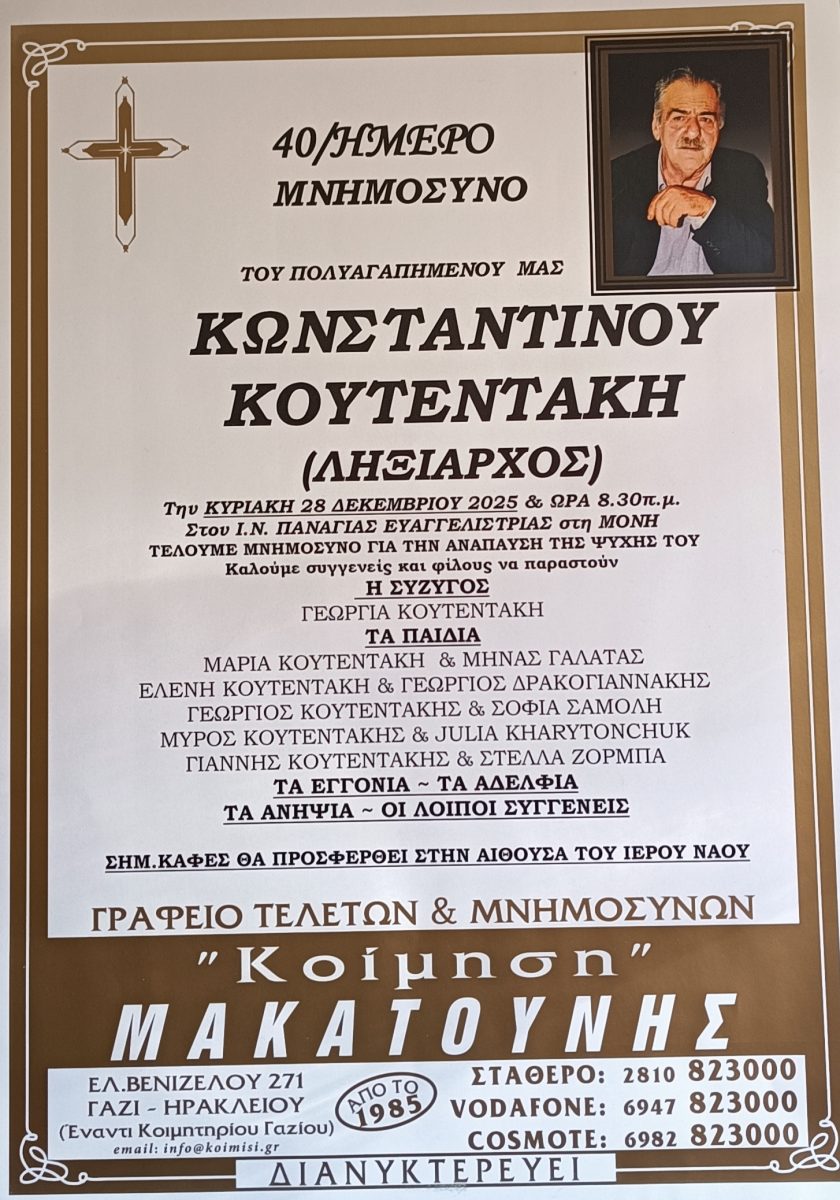 Την Κυριακή 28 Δεκεμβρίου 2025 και ώρα 8:30 π.μ. θα τελεστεί το σαρανταήμερο μνημόσυνο του Κωσταντίνου Κουτεντάκη (Ληξίαρχος) στον Ι.Ν. Παναγίας Ευαγγελίστριας στην Μονή.