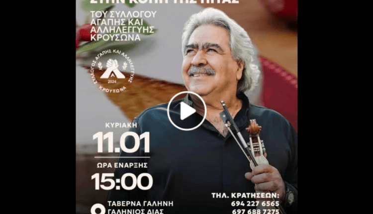 Share FacebookTwitter Ο Σύλλογος Αγάπης και Αλληλεγγύης Κρουσώνα σας προσκαλεί στην, Κοπή της Πρωτοχρονιάτικης Βασιλόπιτας Κυριακή 11 Ιανουαρίου 2026 Ώρα έναρξης: 15:00 Κρητικό Κέντρο «Γαλήνη» Με το συγκρότημα του Νίκου Γωνιανάκη για ένα όμορφο γλέντι με μουσική και κέφι! Κρατήσεις: 694 227 6565 • 697 688 7275 ΣΥΛΛΟΓΟΣ ΑΓΑΠΗΣ ΚΑΙ ΑΛΛΗΛΕΓΓΥΗΣ ΚΡΟΥΣΩΝΑ Zaxarenia Fasoylakh κοπή Βασιλόπιταςσύλλογος Αγάπης και Αλληλεγγύης Κρουσώνα Share FacebookTwitter