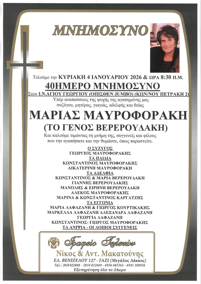 Την Κυριακή 4 Ιανουαρίου 2026, στις 8:30 το πρωί, θα τελεστεί το 40ήμερο μνημόσυνο υπέρ αναπαύσεως της ψυχής της Μαρίας Μαυροφοράκη, το γένος Βερερουλάκη.