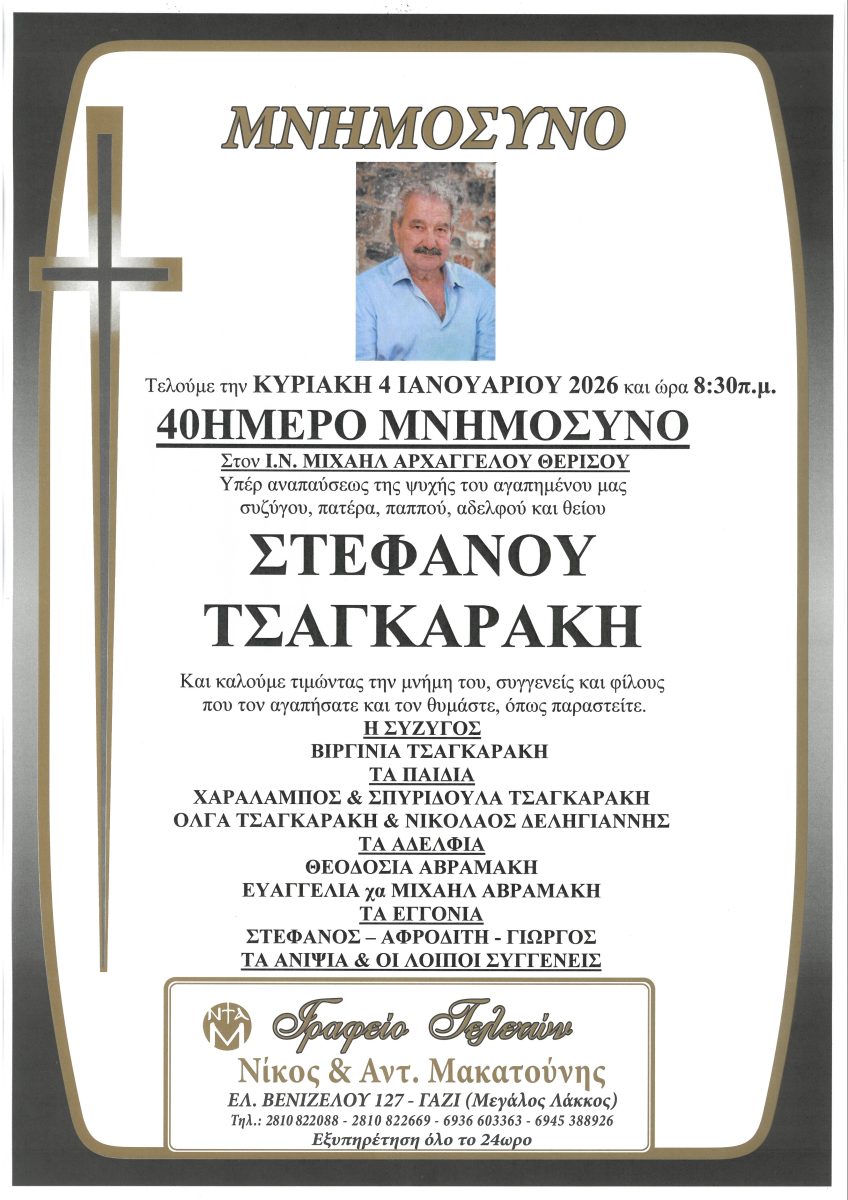 Την Κυριακή 4 Ιανουαρίου 2026, στις 8:30 το πρωί, θα τελεστεί το 40ήμερο μνημόσυνο υπέρ αναπαύσεως της ψυχής του αγαπημένου συζύγου, πατέρα, παππού, αδελφού και θείου Στέφανου Τσαγκαράκη.