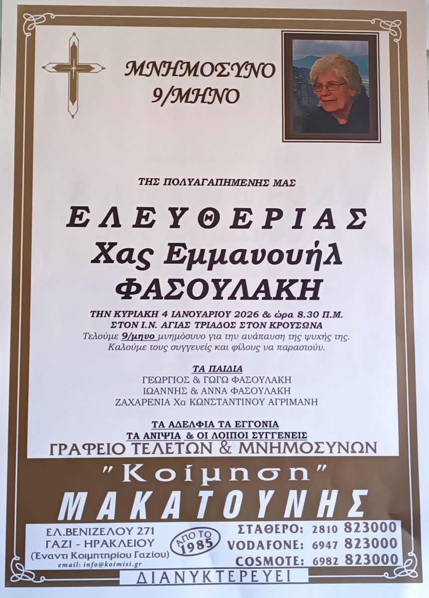 Την Κυριακή 4 Ιανουαρίου το πρωί θα τελεστεί στον Ι.Ν. Αγίας Τριάδος στον Κρουσώνα το 9μηνο μνημόσυνο της Ελευθερίας χας Εμμανουήλ Φασουλάκη.
