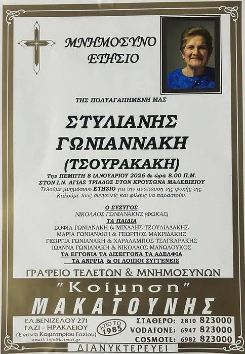 Ένας χρόνος πέρασε από το θάνατο της αγαπητής στην κοινωνία του Κρουσώνα Στέλλας Γωνιαννάκη το γένος Τσουρακάκη. Η οικογένεια της τιμά την μνήμη της τελώντας την ερχόμενη Πέμπτη 8 Ιανουαρίου 2026 το ετήσιο μνημόσυνο για την ανάπαυση της ψυχής της. Το μνημόσυνο θα τελεστή στον Ιερό Ναό της Αγίας Τριάδος στον Κρουσώνα. Ο σύζυγος και τα παιδιά της καλούν τους συγγενείς και φίλους να παραστούν στην τελετή.