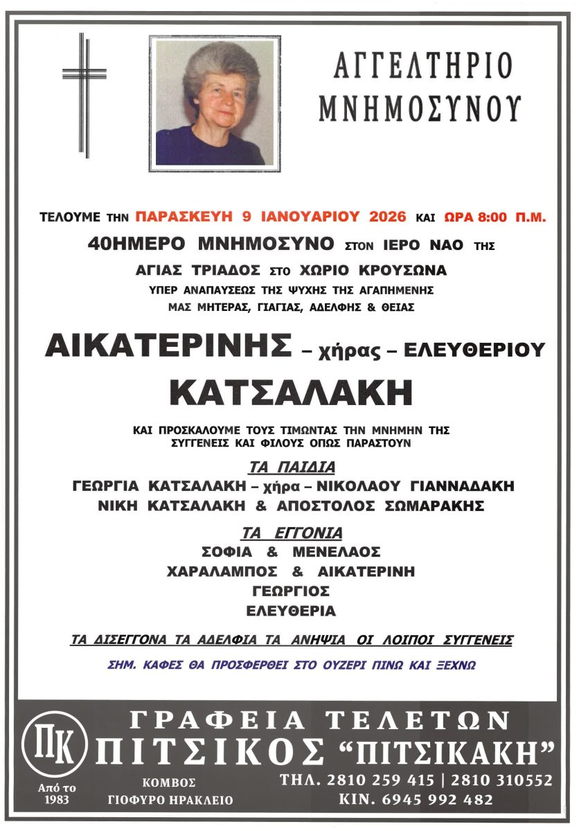 Την Παρασκευή 9 Ιανουαρίου 2026 και ώρα 8:00 π.μ. θα τελεστεί το σαρανταήμερο μνημόσυνο της Αικατερίνης (χας Ελευθερίου) Κατσαλάκη στον Ι.Ν. Αγίας Τριάδος στον Κρουσώνα.
