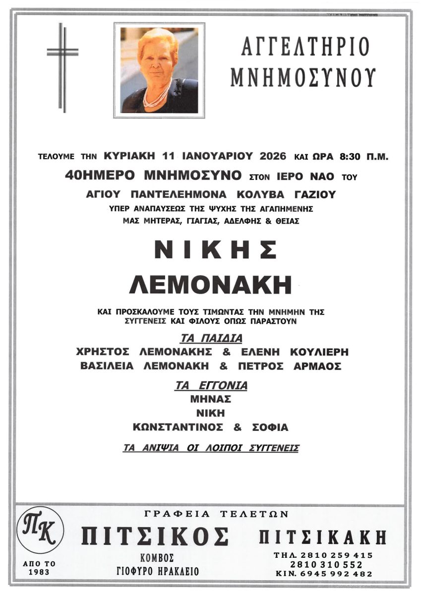 Το σαρανταήμερο μνημόσυνο της Νίκης Λεμονάκη θα τελεστεί την Κυριακή 11 Ιανουαρίου 2026 και ώρα 8:30 π.μ. στον Ι.Ν. Αγίου Παντελεήμονα Κολυβά Γαζίου.