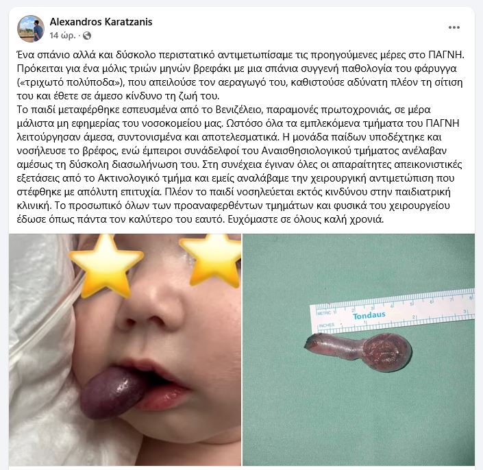 Όλα, όμως, πήγαν καλά και το βρέφος τώρα πια νοσηλεύεται εκτός κινδύνου στην παιδιατρική κλινική του νοσοκομείου. Τα συναισθήματα για την αντιμετώπιση αυτού του σπάνιου περιστατικού μοιράστηκε με τους φίλους του στο facebook ο διακεκριμένος γιατρός Αλέξανδρος Καρατζάνης, ο οποίος έκανε και την σχετική ανάρτηση.