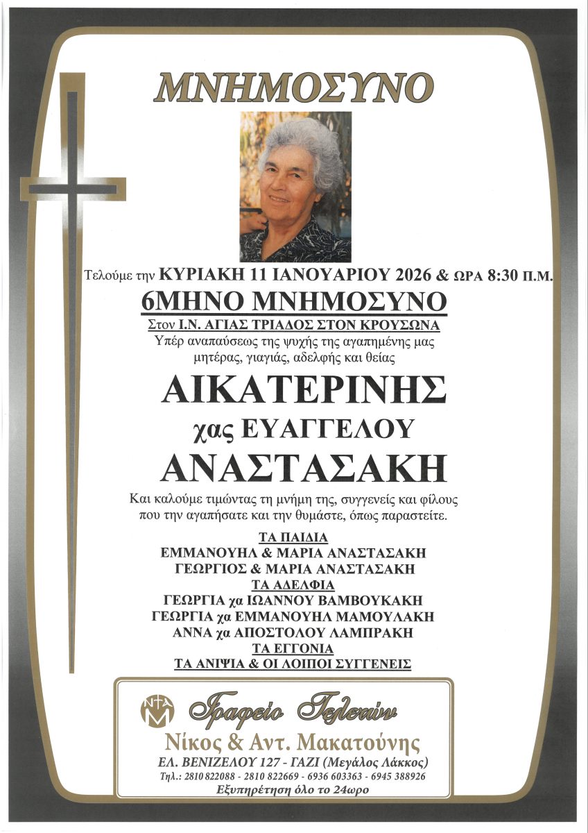 Την Κυριακή 11 Ιανουαρίου στον Ιερό Ναό Αγίας Τριάδας στον Κρουσώνα στις 8.30 π.μ. θα τελεστεί το εξάμηνο μνημόσυνο στη μνήμη της Αικατερίνης χας Ευαγγέλου Αναστασάκη .