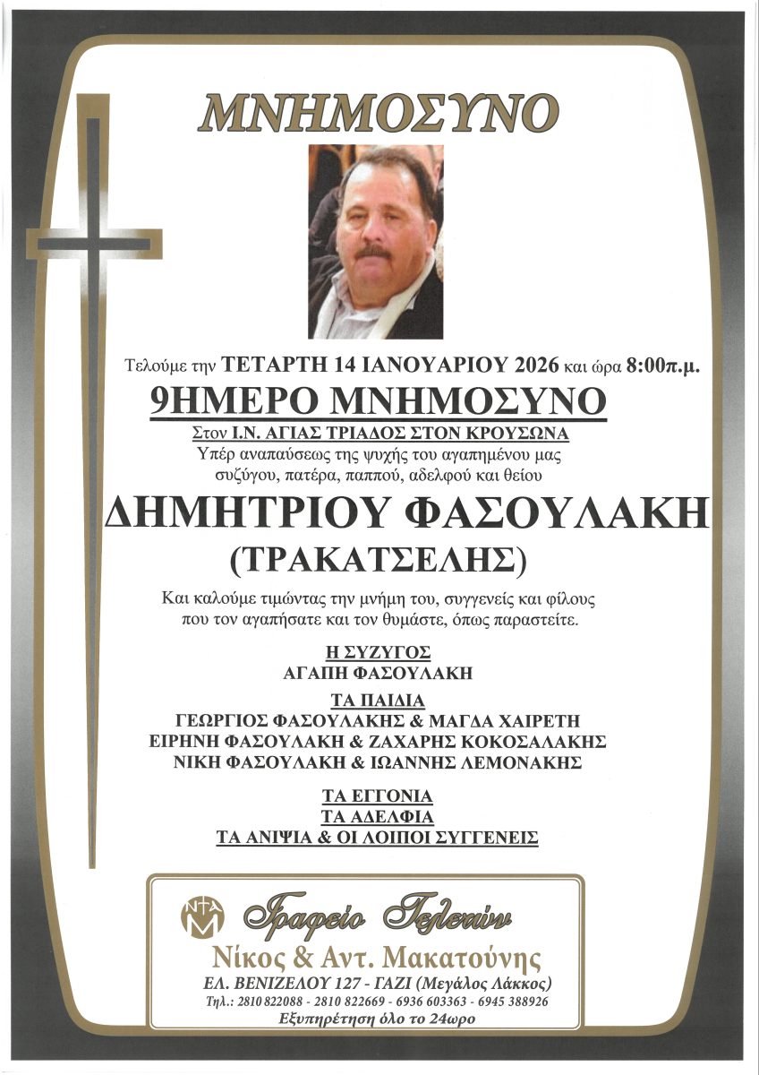 Από τον Ιερό Ναό Αγίας Τριάδος θα τελεστεί την ερχόμενη Τετάρτη 14 Ιανουαρίου το 9ημερο μνημόσυνο στη μνήμη του Δημήτρη Φασουλάκη.