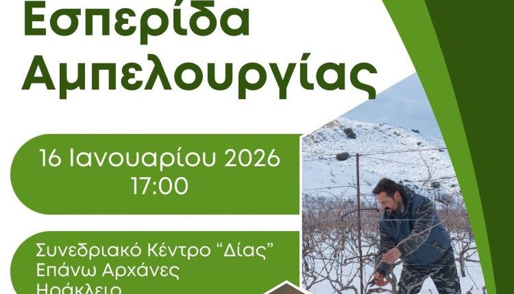 Εσπερίδα με θέμα την Αμπελουργία διοργανώνει το Δίκτυο Οινοποιών Κρήτης, με την υποστήριξη της Περιφέρειας Κρήτης, την Παρασκευή 16 Ιανουαρίου 2026 στις 17:00, στο Συνεδριακό Κέντρο «Δίας» στις Αρχάνες Ηρακλείου.