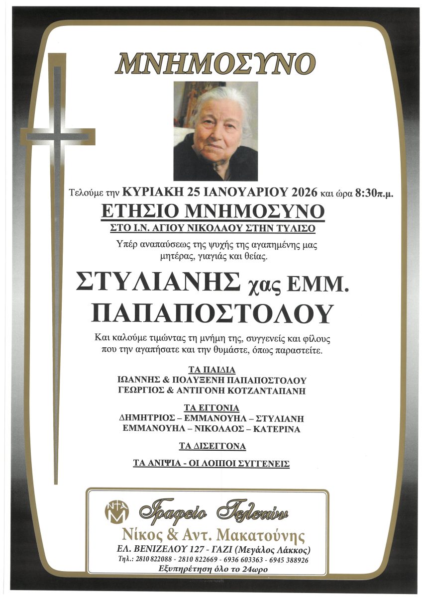 Ετήσιο μνημόσυνο για την ανάπαυση της ψυχής της αγαπημένης μητέρας, γιαγιάς και θείας Στυλιανής χας Εμμ. Παπαποστόλου τελείται την Κυριακή 25 Ιανουαρίου 2026, στις 8:30 το πρωί, στον Ιερό Ναό Αγίου Νικολάου στην Τύλισο.