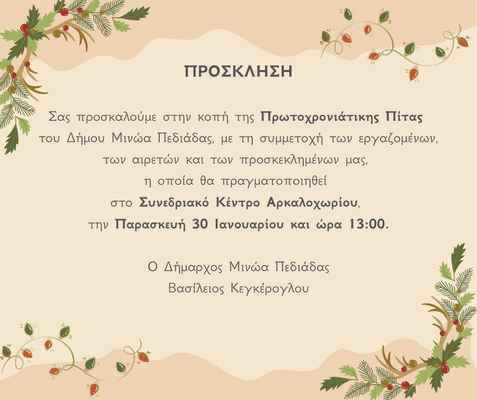 Την κοπή της πρωτοχρονιάτικης πίτας του πραγματοποιεί ο Δήμος Μινώα Πεδιάδας την Παρασκευή 30 Ιανουαρίου, στις 13:00, στο Συνεδριακό Κέντρο Αρκαλοχωρίου.