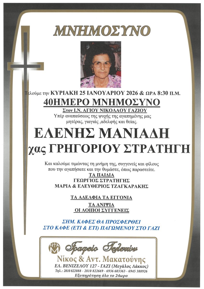 Στον Ι.Ν. Αγίου Νικολάου στο Γάζι θα τελεστεί το σαρανταήμερο μνημόσυνο της Ελένης Μανιαδή (χας Γρηγορίου Στρατήγη) την Κυριακή 25 Ιανουαρίου 2026 και ώρα 8:30 π.μ.