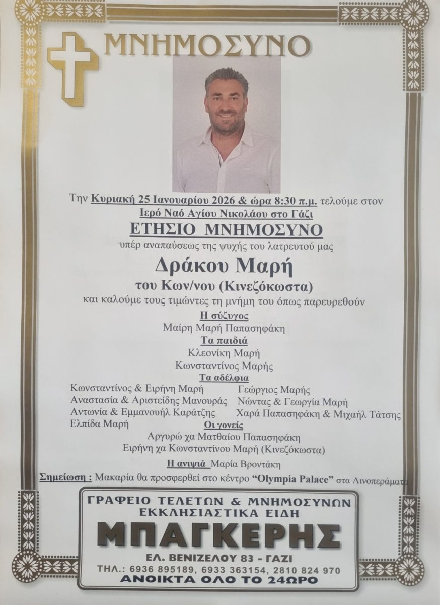 Την Κυριακή 25 Ιανουαρίου στις 8.30 π.μ. θα τελεστεί το ετήσιο μνημόσυνο του Δράκου Μαρή στον Ι.Ν. Αγίου Νικολάου στο Γάζι.