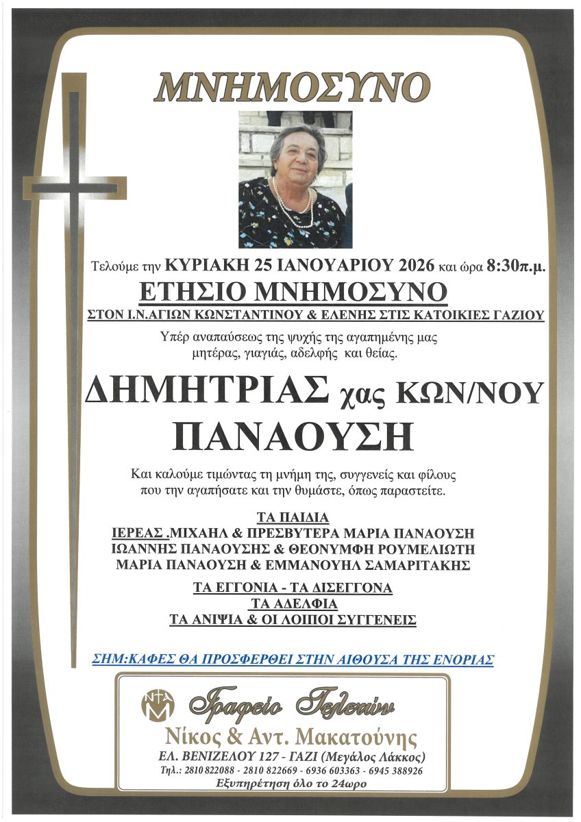 Την Κυριακή 25 Ιανουαρίου 2026 και ώρα 8:30 π.μ. θα τελεστεί το ετήσιο μνημόσυνο της Δημητρίας (χας Κωνσταντίνου) Παναούση στον Ι.Ν. Αγίων Κωνσταντίνου και Ελένης στις εργατικές κατοικίες Γαζίου.