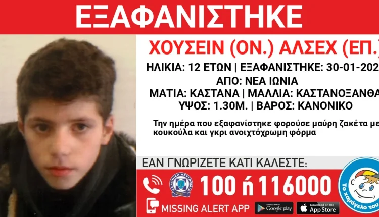 «Στις 30/01/2026 στο διάστημα από ώρα 14:50-15:07 εξαφανίστηκε από χώρο φιλοξενίας ασυνόδευτων ανηλίκων στην περιοχή της Νέας Ιωνίας, o HUSSEIN (ον.) ALSHEH (επ.), 12 ετών, συριακής καταγωγής. Το «Χαμόγελο του Παιδιού» ενημερώθηκε και προχώρησε σε δημοσιοποίηση των στοιχείων του ανήλικου, κατόπιν εισαγγελικής εντολής , καθώς ενδεχομένως να συντρέχουν λόγοι που θέτουν την ζωή του σε κίνδυνο.