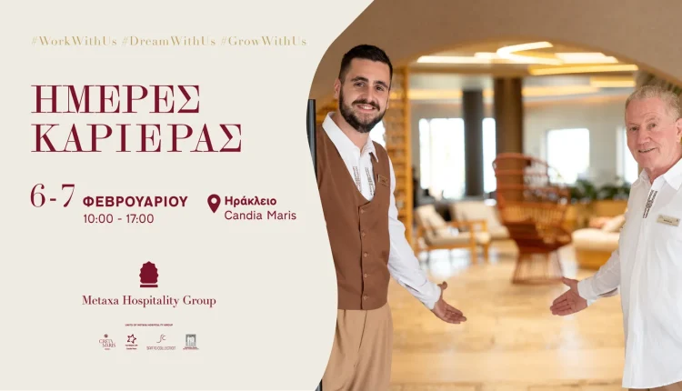 Το Metaxa Hospitality Group, αναγνωρισμένος ως «Κορυφαίος Όμιλος Φιλοξενίας στην Ελλάδα 2021-2025» από τα World Travel Awards, διοργανώνει και φέτος τις «Ημέρες Καριέρας» στις 6 και 7 Φεβρουαρίου στο Ηράκλειο Κρήτης, προσφέροντας σημαντικές ευκαιρίες απασχόλησης στα ξενοδοχεία του στην Κρήτη και τη Σαντορίνη.