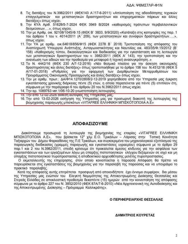 Η Περιφέρεια – κατόπιν ελέγχου μετά τη φονική έκρηξη στο εργοστάσιο Βιολάντα – προχώρησε στο κλείσιμο του εργοστασίου Vitafree που βρίσκεται στο 12χλμ της εθνικής Τρικάλων – Λαρίσης λόγω έλλειψης των απαραίτητων πιστοποιητικών πυροπροστασίας και σχετικών μελετών. Ωστόσο, σύμφωνα με ρεπορτάζ της ΕΡΤ, κατά την έρευνα των Αρχών εντοπίστηκε διαρροή αερίου και πλέον τις έρευνες αναλαμβάνει η Διεύθυνση Αντιμετώπισης Εγκλημάτων Εμπρησμού.