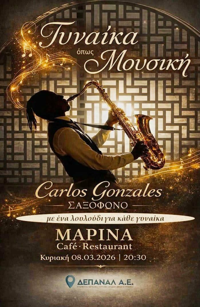 Μια βραδιά γεμάτη μελωδίες σαξοφώνου με τον υπέροχο CarlosGonzalez, θα πραγματοποιηθεί την Κυριακή 8 Μαρτίου, στις 20:30 στο MarinaCaféRestaurant.