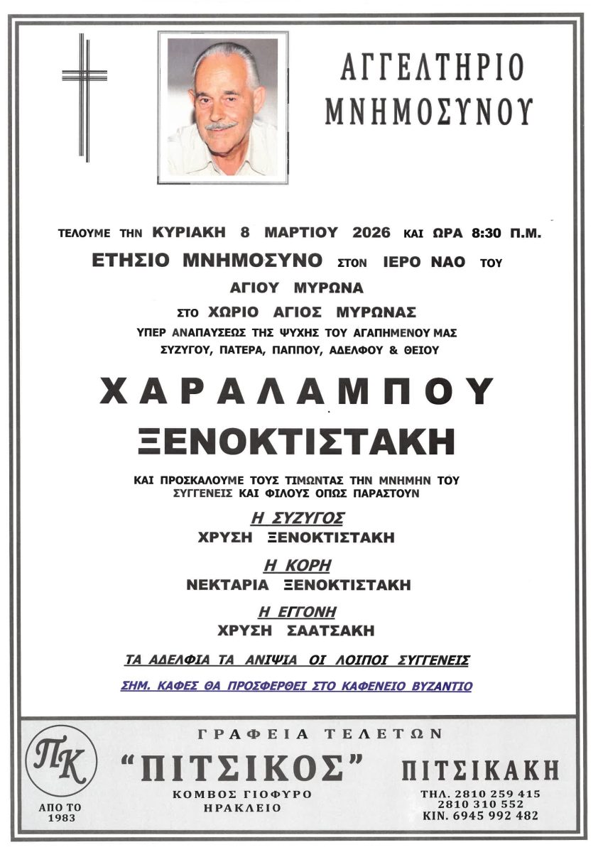 Την Κυριακή 8 Μαρτίου στις 8.30 μ.μ. στον Ι.Ν. Αγίου Μύρωνα στο χωριό Άγιος Μύρωνας θα τελεστεί το ετήσιο μνημόσυνο του Χαράλαμπου Ξενοκτιστάκη.