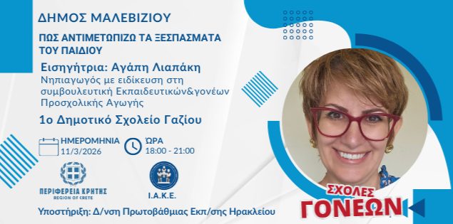 Η συνάντηση πραγματοποιείται από την Περιφέρεια Κρήτης και το ΙΑΚΕ – Ινστιτούτο Ανθρωπιστικών και Κοινωνικών Επιστημών, σε συνεργασία με τον Δήμο Μαλεβιζίου και τη Διεύθυνση Πρωτοβάθμιας Εκπαίδευσης Ηρακλείου, στο πλαίσιο του 2ου κύκλου της Σχολής Γονέων.