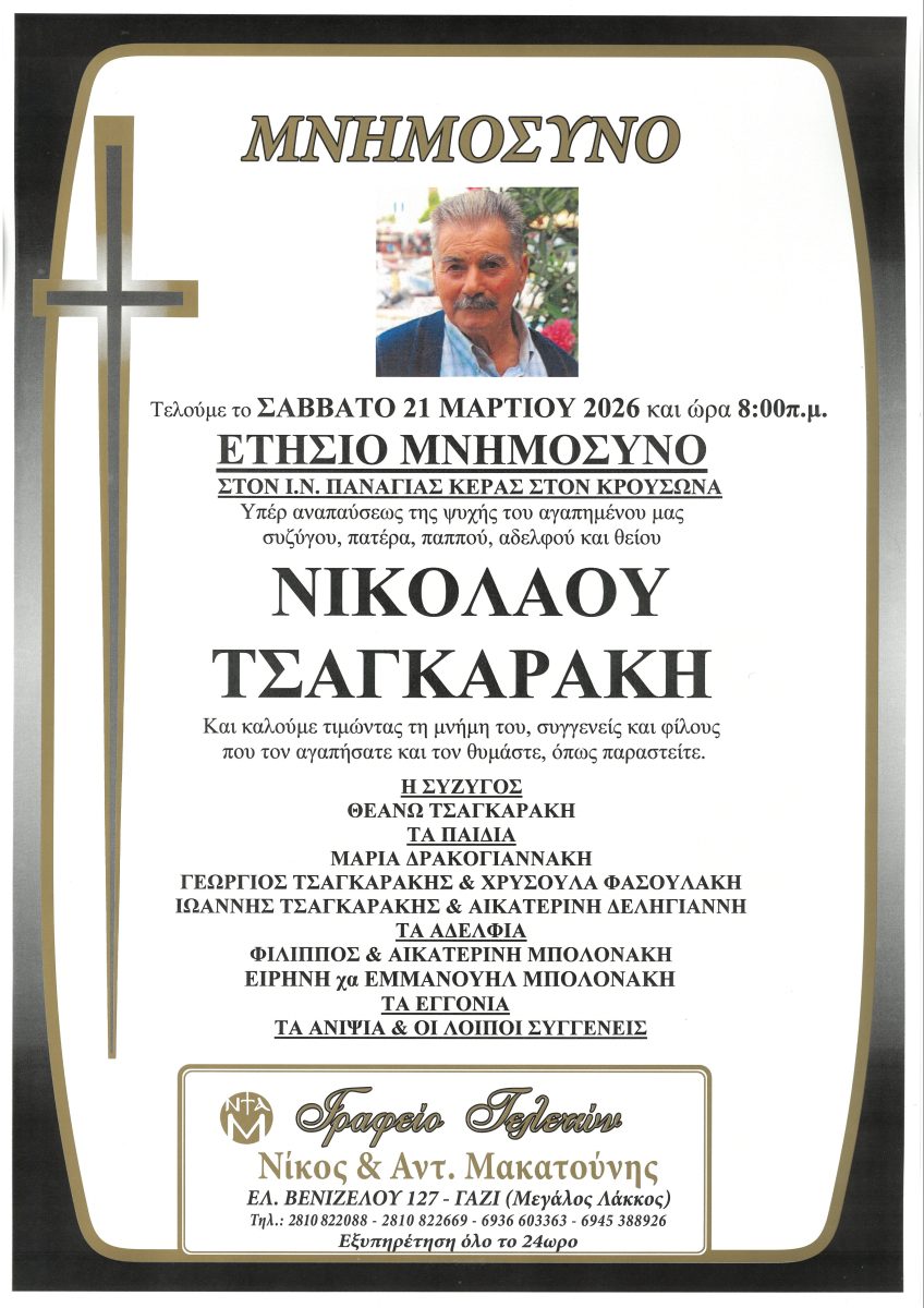 Ετήσιο μνημόσυνο υπέρ αναπαύσεως του Αείμνηστου Νικόλαου Τσαγκαράκη, πραγματοποιείται στον Ιερό Ναό Παναγιάς Κεράς Κρουσώνα, το Σάββατο 21 Μαρτίου και ώρα 8:00 πμ.