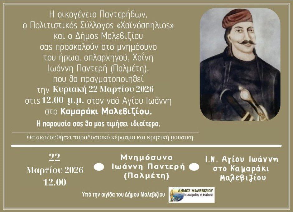 Ο Δήμος Μαλεβιζίου, ο Πολιτιστικός Σύλλογος Καμαρακίου «Ο Χαϊνόσπηλιος» και η οικογένεια των Παντερήδων τιμούν τη μνήμη του Καπετάν Ιωάννη Παλμέτη – Παντερή, μιας εμβληματικής μορφής των Κρητικών Επαναστάσεων, την Κυριακή 22 Μαρτίου στις 12:00, με επιμνημόσυνη δέηση που θα τελεστεί στον Ιερό Ναό Αγίου Ιωάννη στο Καμαράκι.
