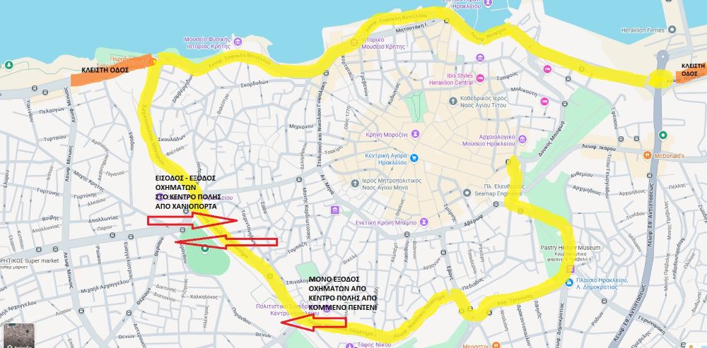 - Η κάθοδος της Λεωφόρου Δημοκρατίας προς το κέντρο Ηρακλείου θα είναι ανοικτή, με κατεύθυνση προς Καπετανάκειο – Ανθεμίου – Αρχιμήδους – Τίτου Γεωργιάδη – Λ. Ικάρου.