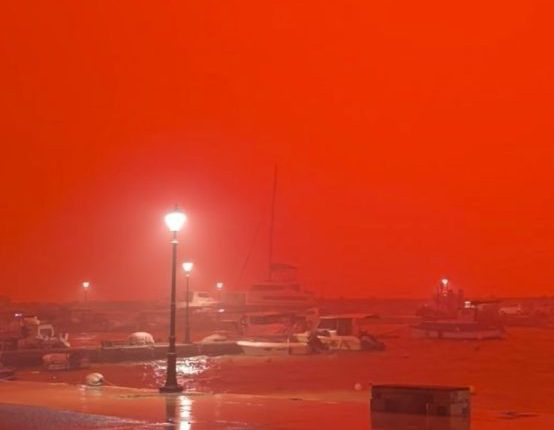 σκόνη, σε συνδυασμό με την υγρασία και τον φωτισμό του λιμανιού, «έβαψε» τον νυχτερινό ουρανό με ένα βαθύ, απόκοσμο κόκκινο χρώμα.