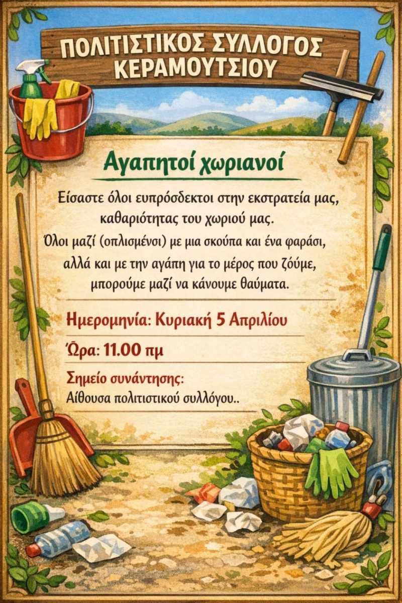 Σε μια προσπάθεια αναβάθμισης της εικόνας του χωριού και ενίσχυσης του εθελοντισμού, ο Πολιτιστικός Σύλλογος Κεραμουτσίου διοργανώνει εκστρατεία καθαριότητας την προσεχή Κυριακή, 5 Απριλίου.