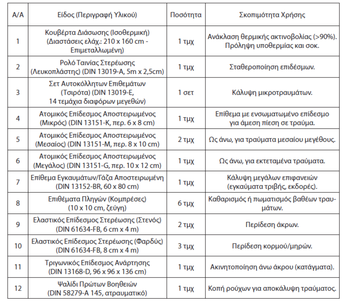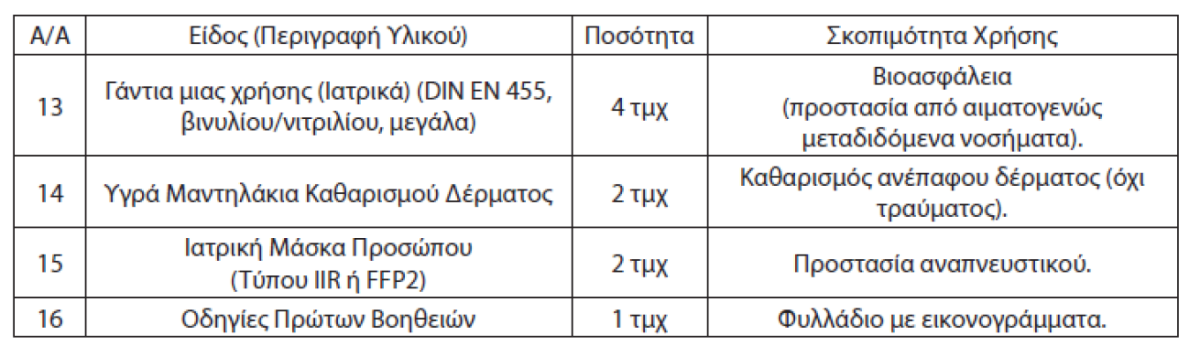 Ανάμεσά τους περιλαμβάνονται κουβέρτα διάσωσης ισοθερμική με συγκεκριμένες διαστάσεις, λευκοπλάστης, τραυμοπλαστ, επιδέσμους, επιθέμα εγκαυμάτων και πληγών, ψαλίδι πρώτων βοηθειών, γάντια μιας χρήσης, υγρά μαντιλάκια καθαρισμού δέρματος, ιατρική μάσκα προσώπου και οδηγίες πρώτων βοηθειών.