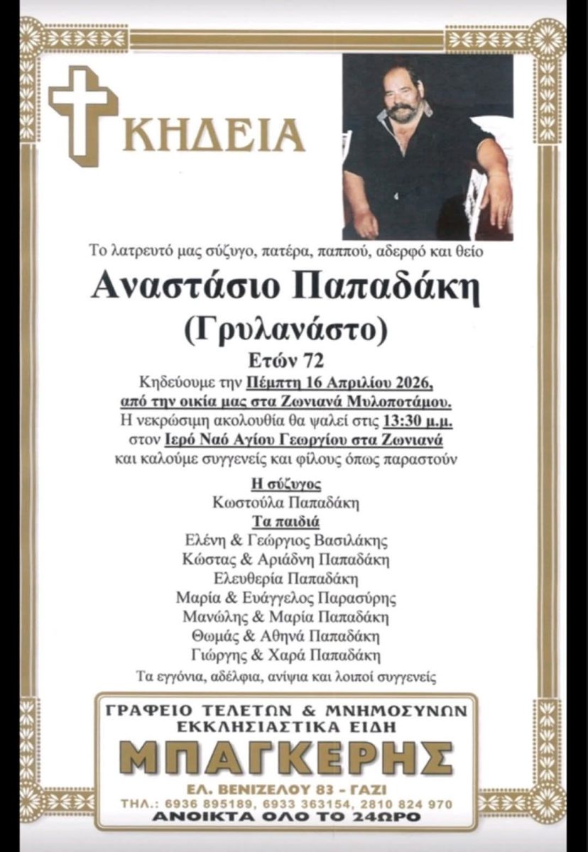 Οικογένεια, συγγενείς και φίλοι αποχαιρετούν σήμερα, Πέμπτη, τον Αναστάσιο Παπαδάκη (Γρυλανάστο), που έφυγε από τη ζωή.
