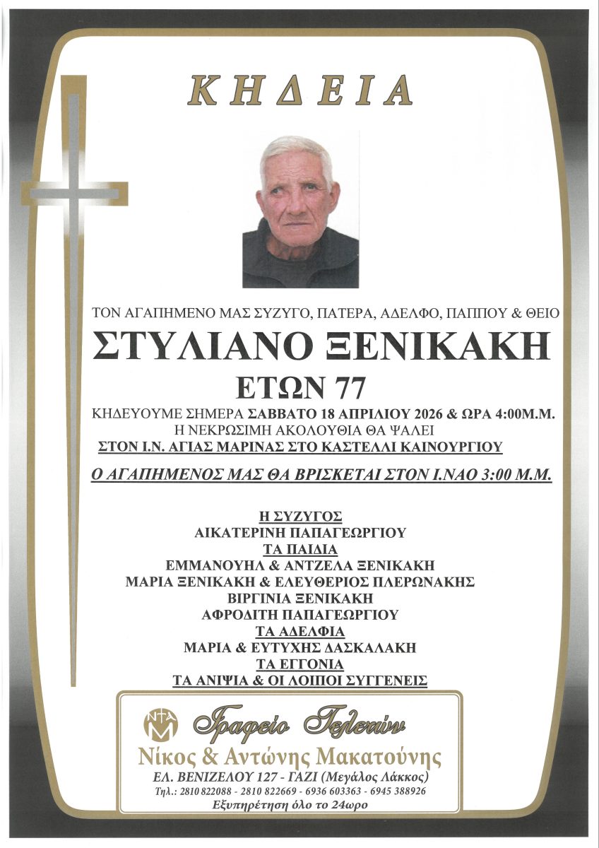 Σήμερα Σάββατο 18 Απριλίου στις 4.00 μ.μ. στον Ι.Ν. Αγίας Μαρίνας στο Καστέλι Καινουργίου θα τελεστεί η κηδεία του Στυλιανού Ξενικάκη.