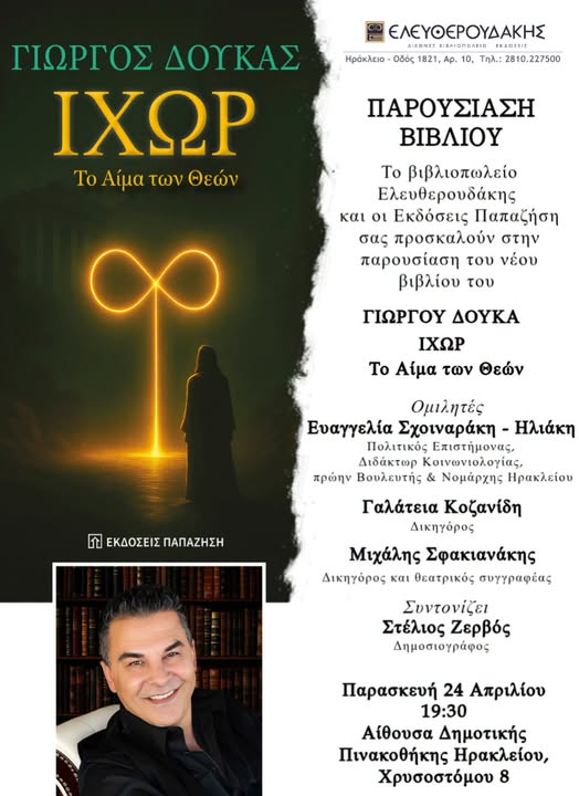 Παρουσίαση Βιβλίου: “ΙΧΩΡ Το Αίμα των Θεών” του Γιώργου Δούκα Το βιβλιοπωλείο Ελευθερουδάκης και οι Εκδόσεις Παπαζήση σας προσκαλούν στην παρουσίαση του νέου βιβλίου του Γιώργου Δούκα, “ΙΧΩΡ Το Αίμα των Θεών”.