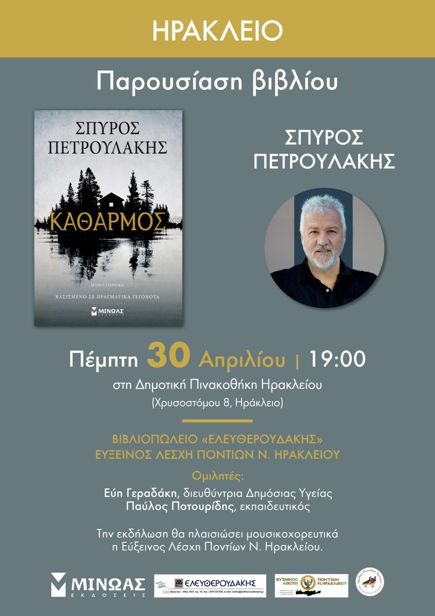 Το Βιβλιοπωλείο Ελευθερουδάκης Ηρακλείου, οι Εκδόσεις Μίνωας και η Εύξεινος Λέσχη Ποντίων Ν. Ηρακλείου, σας προσκαλούν στην παρουσίαση του νέου βιβλίου του Σπύρου Πετρουλάκη, ΚΑΘΑΡΜΟΣ. Ομιλητές: Εύη Γεραδάκη, διευθύντρια Δημόσιας Υγείας, Παύλος Ποτουρίδης, εκπαιδευτικός. Την εκδήλωση θα πλαισιώσει μουσικοχορευτικά η Εύξεινος Λέσχη Ποντίων Ν. Ηρακλείου.