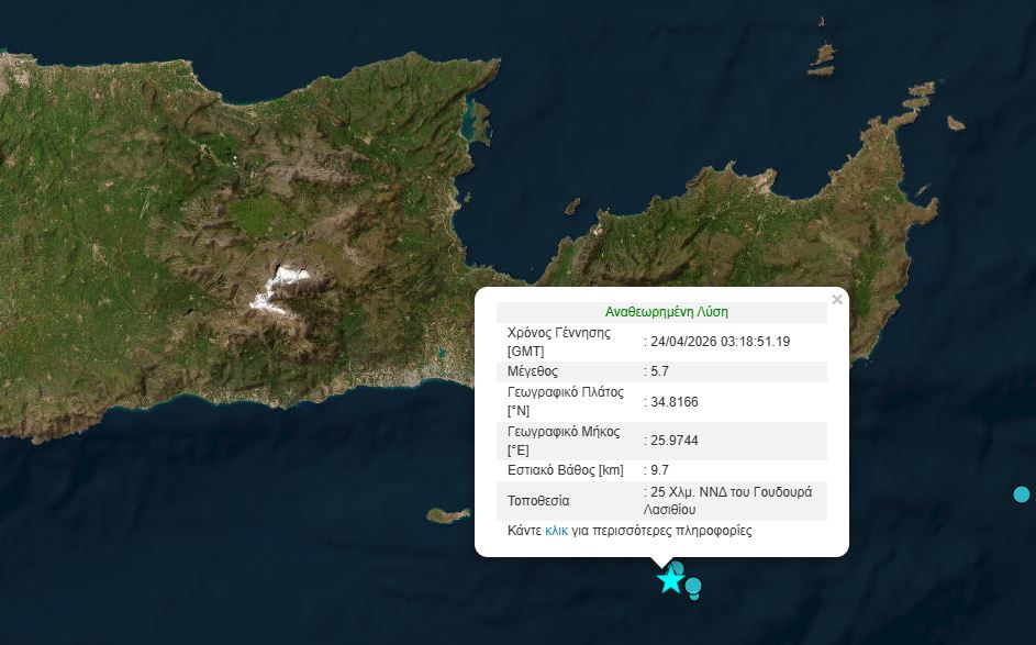 Σύμφωνα με την αναθεωρημένη λύση του Γεωδυναμικού Ινστιτούτου ο σεισμός ήταν μεγέθους 5,7 Ρίχτερ και το επίκεντρό του εντοπίζεται ανοιχτά της Ιεράπετρας και συγκεκριμένα 25 χλμ. νότια – νοτιοδυτικά του Γουδουρά Λασιθίου.