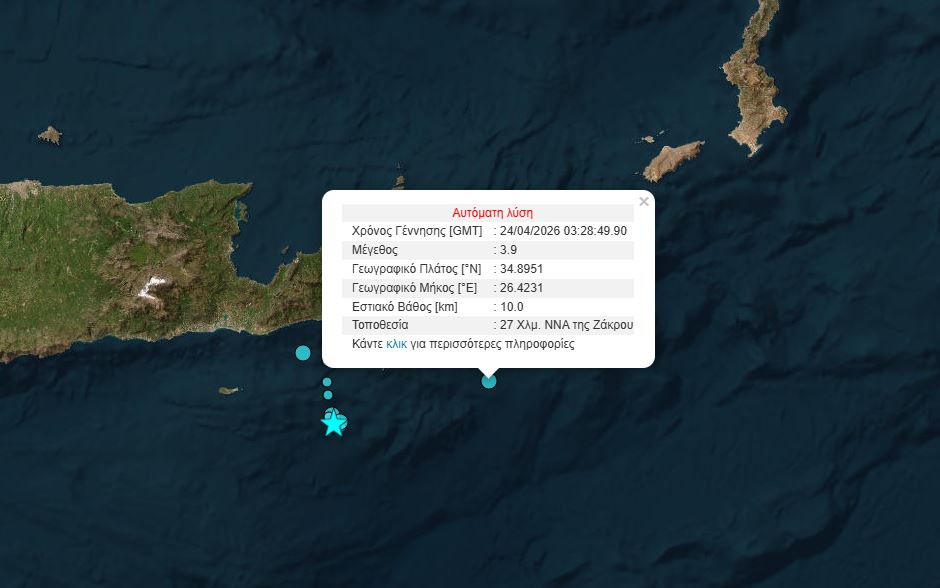 Λίγα λεπτά αργότερα, στις 6:28, ένας ακόμη σεισμός σημειώθηκε στην περιοχή. Η σεισμική δόνηση είχε μέγεθος 3,9 Ρίχτερ και το επίκεντρό της εντοπίζεται 27 χλμ. νότια – νοτιοανατολικά της Ζάκρου.