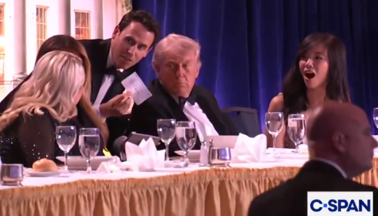 Σε βίντεο του Γαλλικού Πρακτορείου, φαίνεται ο πρόεδρος Τραμπ καθισμένος στο τιμητικό τραπέζι μαζί, μεταξύ άλλων, με τον αντιπρόεδρο Τζέι Ντι Βανς και την εκπρόσωπό του Καρολάιν Λέβιτ, καθώς και δημοσιογράφους, ενώ ακούγονται κρότοι που αρχικά δεν προκαλούν καμιά αντίδραση.
