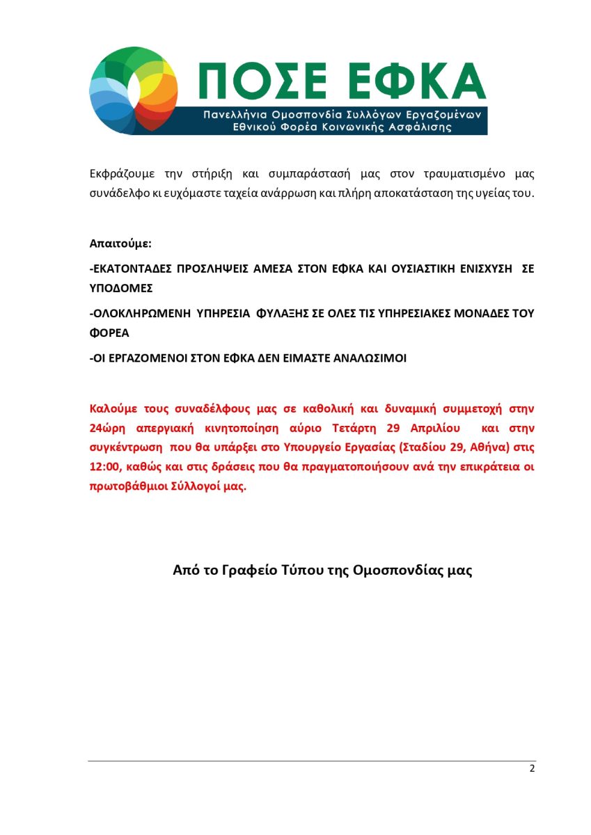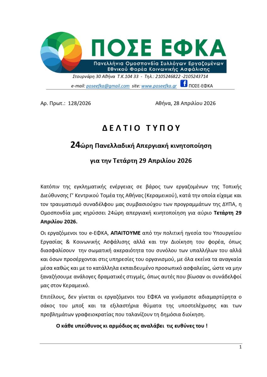 Με 24ωρη Πανελλαδική κινητοποίηση την Τετάρτη 29/4/2026, απαντούν οι εργαζόμενοι του e -EFKA τόσο κατά της εγκληματικής ενέργειας που διενεργήθηκε από τον ηλικιωμένο εναντίον τους , όσο και για την ανάληψη ευθυνών από την πλευρά της πολιτείας ώστε να μπορούν να αποφευχθούν παρόμοια συμβάντα ή άλλα που θέτουν σε κίνδυνο τη ζωή  των εργαζομένων .